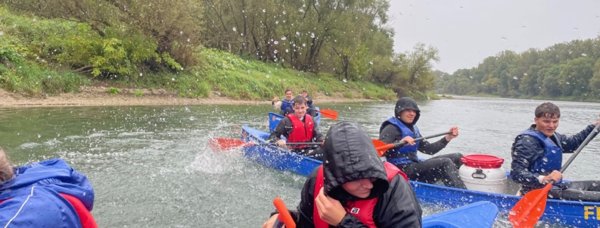Am darauffolgenden Tag ging es trotz amtlicher Unwetterwarnung in die Fluten des Altrheins. Wir meisterten eine Kanutour trotz widrigster Bedingungen und fuhren von Istein bis nach Bad Bellingen bei strömendem Regen. Zum Glück blieben wenigstens die gemeldeten Sturmböen aus. Am Ende der 3-stündigen Kanufahrt wussten wir nicht mehr, ob wir mehr von oben durch den Regen oder von der Seite durchs gegenseitige Anspritzen mit dem Paddel nass geworden sind. Es war definitiv ein unvergessliches Abenteuer und hat uns als Klasse gut zusammengeschweißt.